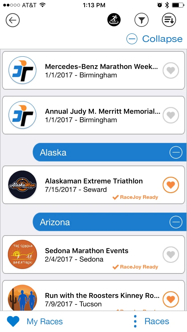 Races offering RaceJoy's live tracking and cheers have a RaceJoy Ready badge next to the listing.