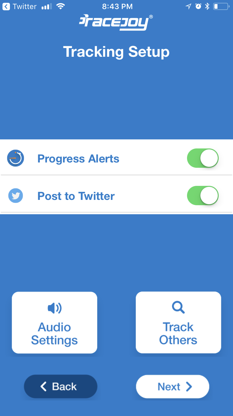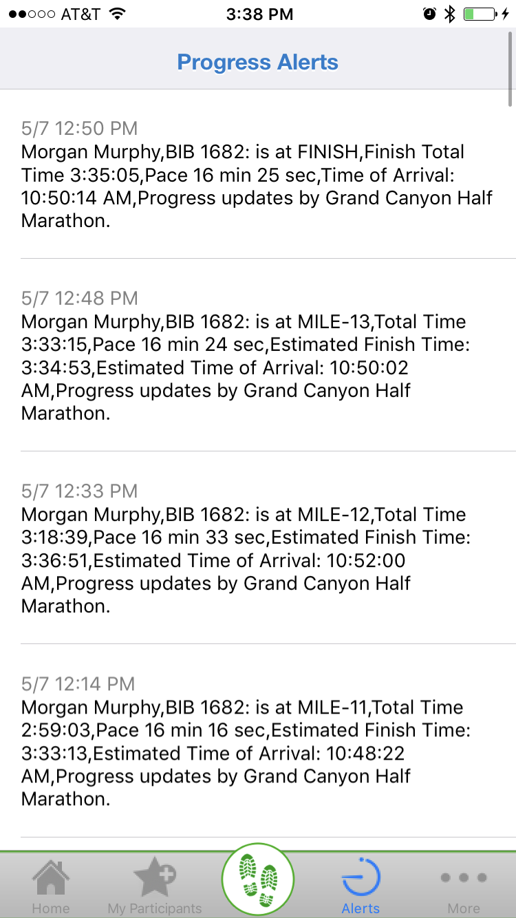 RaceJoy issues progress updates based upon you crossing milestones on the course. Typically, these are sent at every mile and include pace and estimated finish time. Participants receive alerts in audio format and spectators receive an in-app notification.