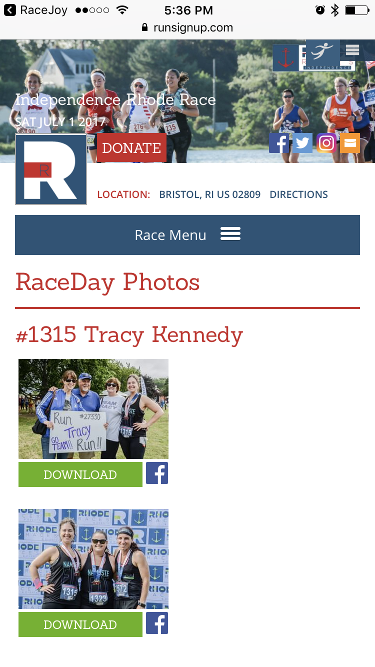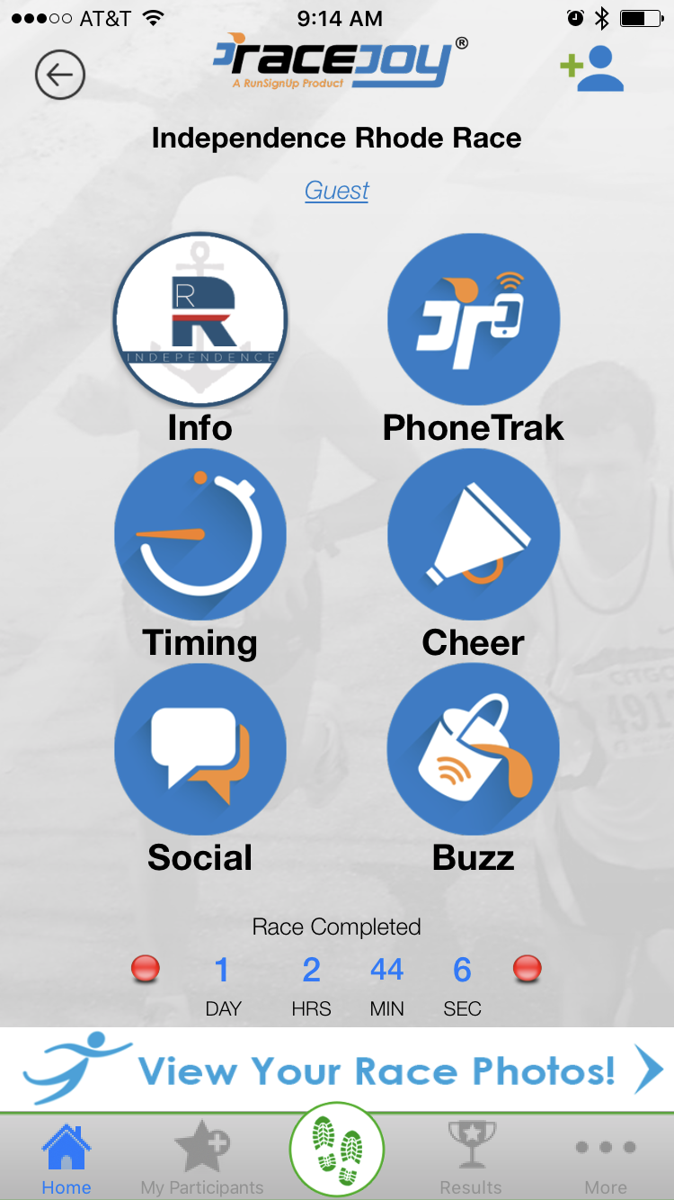 Some races offer direct access to your race day photos from RaceJoy. When this is available, you will see a Photos Available banner ad appear after the race on the main race screen or your individual results page.